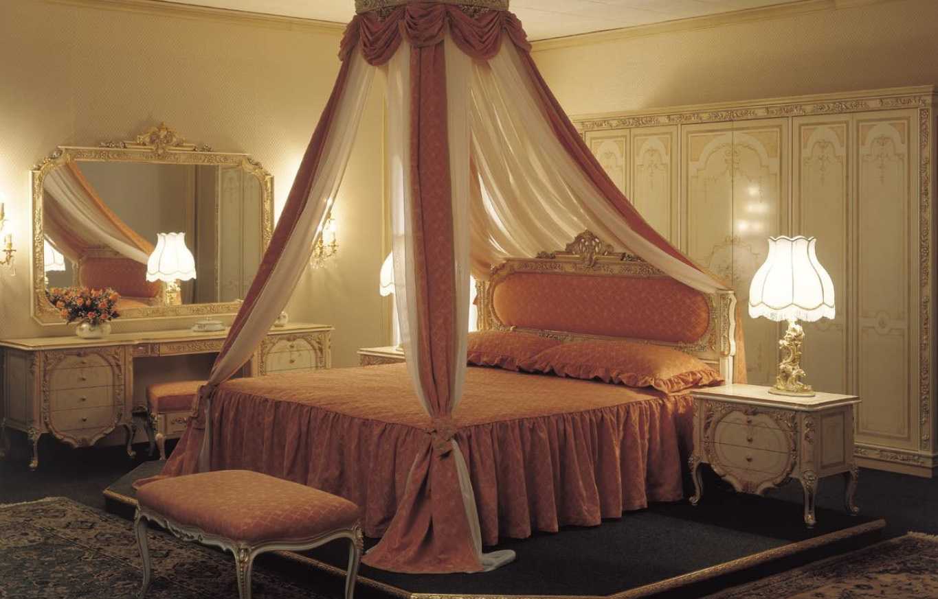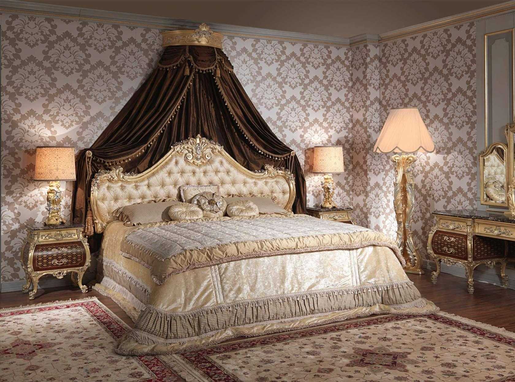 Балдахин над кроватью просто незаменим в стиле барокко. Главная его черта – помпезность. Здесь будет уместно оформление под золото, а королевская кровать должна декорироваться плотной драпировкой из дорогой элитной ткани.
