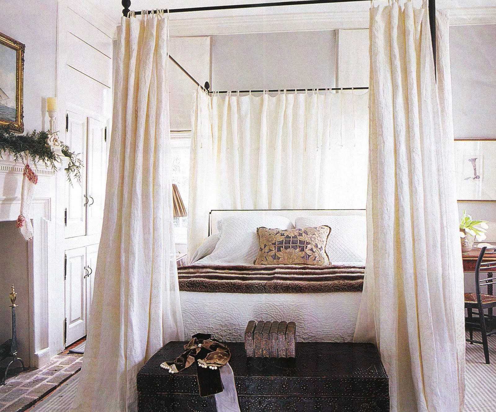 Понадобятся легкие воздушные занавески из тюля, задрапированные на шторной ленте, и потолочные карнизы общей длиной, равной периметру кровати или немного больше. Длина занавесок равна расстоянию от потолка до пола в вашей спальне.