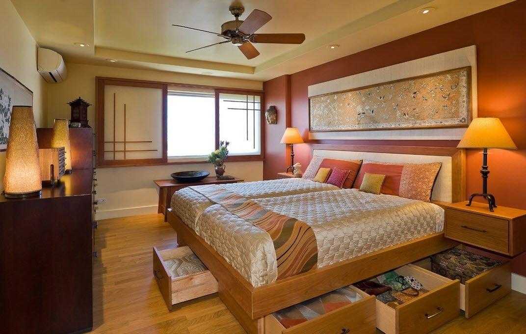 Синий, оранжевый, красный, зеленый – связывающие акценты, которые могут быть включены в дизайн японской спальни через живопись, постельное белье, небольшие декоративные аксессуары.