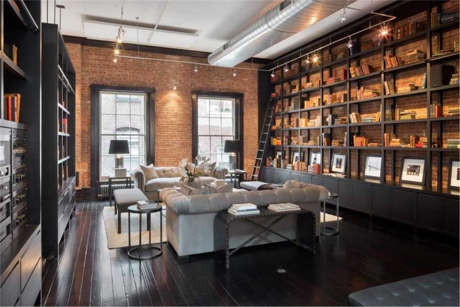Интерьер гостиной с высокими потолками украсит конструкция из вентиляционных труб или потолочных балок. Стены могут быть отделаны кирпичной кладкой, деревянными панелями или грубо оштукатурены. Напольное покрытие выполняют из ламината или техникой наливного пола. Натуральный бетонный пол покрывают небольшим ковром с коротким ворсом.