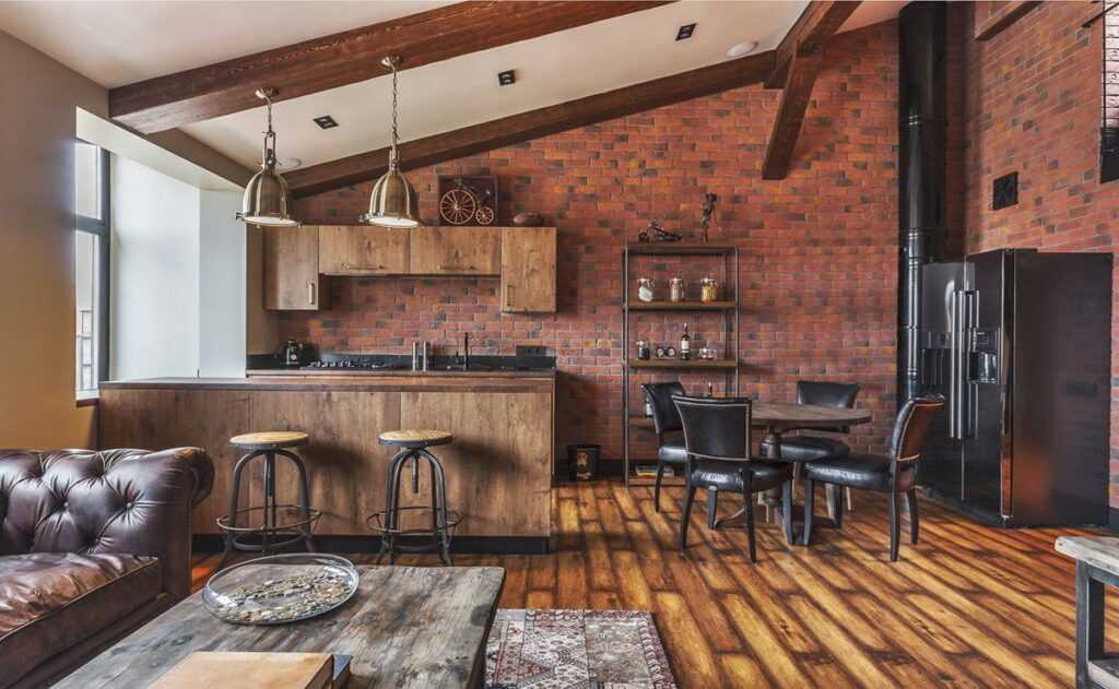 2. имитация кирпича. У обывателей индустриальная стилистика нередко ассоциируется с кирпичной стеной, и в этом есть доля справедливости. Однако уместен именно кирпич, а не имитации. Обои или бюджетная плитка «под кирпич» не годятся;