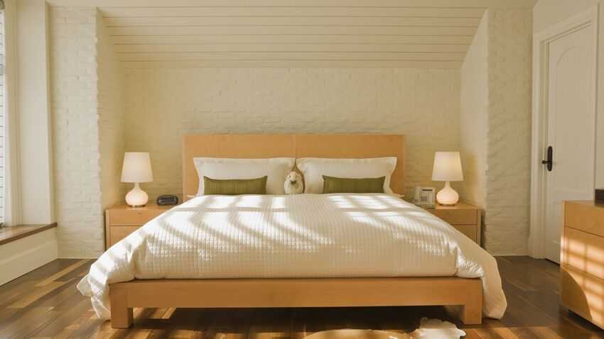 Выбирая кровать в стиле минимализм, предпочтение надо отдавать простым изделиям, лишенным декора (орнамент, резьба, роспись). Если есть желание сделать кровать главным элементом интерьера, то отделка для стен, пола подбирается неброская (однотонная или с мелким орнаментом) и устанавливается минимум дополнительной мебели.