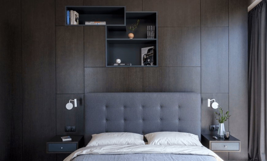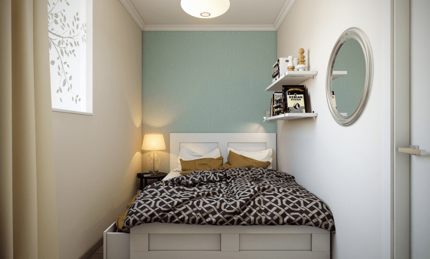 - Кровать следует поставить так, чтобы со всех стороны (кроме стороны изголовья) у неё остались свободными проходы. Вместо прикроватных тумбочек можно выбрать подвесные, так как они будут занимать меньше места. Другая альтернатива — повесить над кроватью полки.
