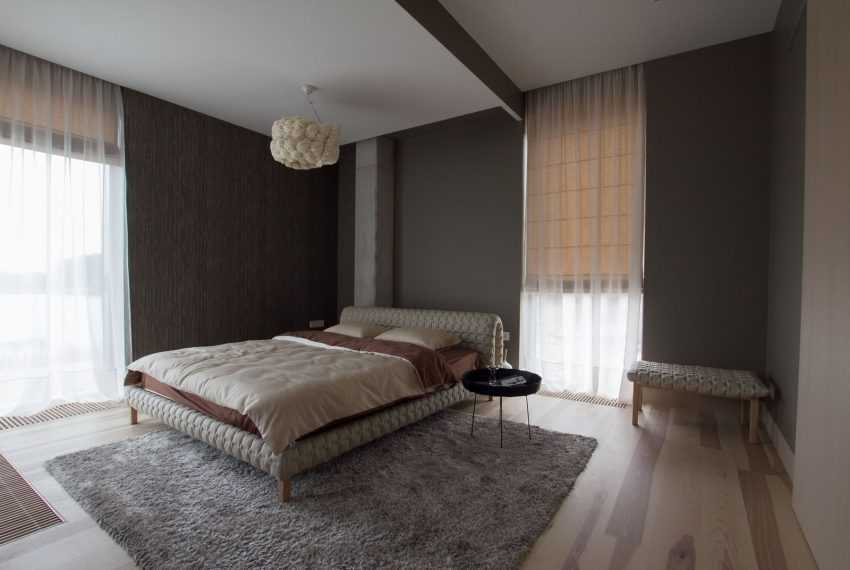 - Минималистичная спальная комната представляет собой открытое пространство, лишенное перегородок.