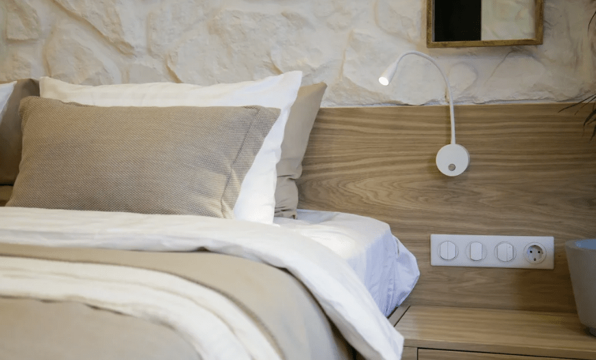 Важно придерживаться единой цветовой гаммы и не допускать возникновения визуального шума — его могут создать одежда и другие предметы на прикроватных тумбочках. Все это лучше скрывать от взгляда