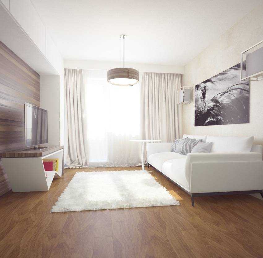 Диван в гостиной, как и другая мебель, должен быть геометрических форм и без высокой спинки. Мебель можно отодвинуть от стен и таким образом зонировать пространство. Журнальный столик и телевизор также не должны выделяться на общем фоне. Имеет смысл использовать многоуровневое освещение, чтобы наполнить помещение воздухом. Ковер допустим, но из той же цветовой палитры, что и весь интерьер. Не принято вписывать в минималистичный интерьер высокие вычурные шкафы или буфеты. Если место для хранения в гостиной все же необходимо, лучше заказать встроенные шкафы.