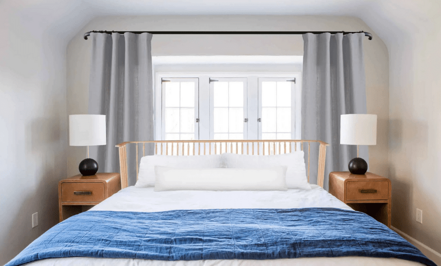 Атмосферу простора в спальне придает обильное освещение. Чтобы в комнату попадало как можно больше естественного света, можно установить большие панорамные окна. Их оформляют легкими занавесками или жалюзи.