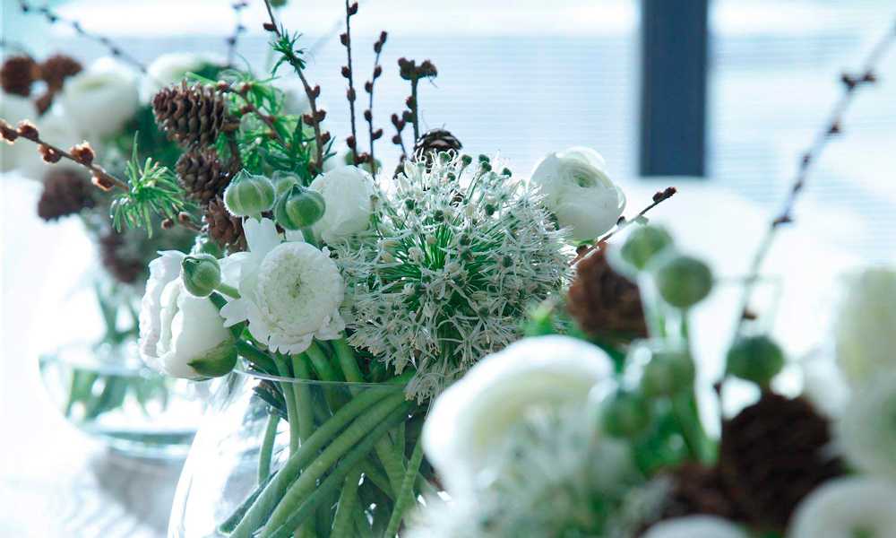 - сухие и живые растения, спилы веток, зелень, искусственные цветы;
