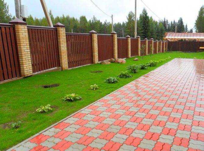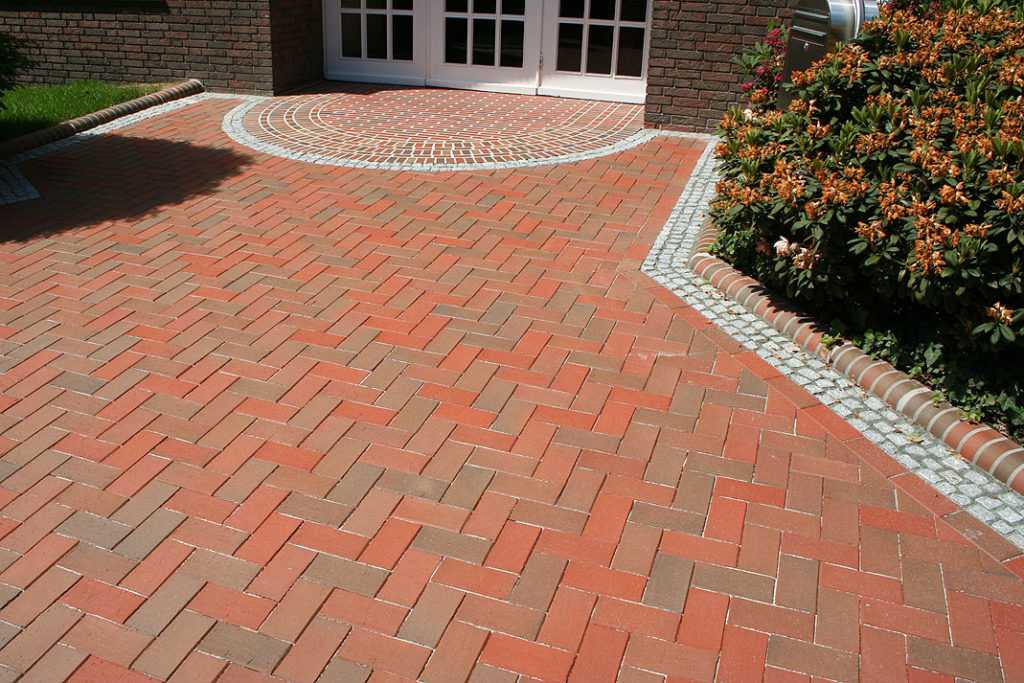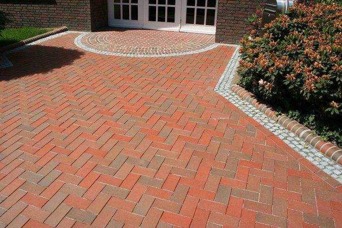 Важно подобрать вариант укладки плитки, который будет сочетаться с ландшафтным дизайном и оформлением дома. Простая кирпичная укладка (ложок), позволяет сэкономить материал, красиво смотрится при использовании элементов различных оттенков