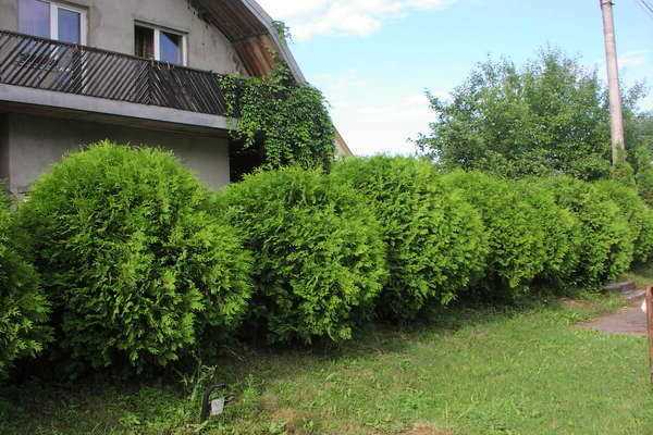 Туя западная шаровидная, вполне может быть изгородью средней высоты. Главное преимущество – такая «ограда» не нуждается в стрижке. Такие низкорослые сорта деревьев смело можно использовать, например, как солитёр при оформлении аллеи. К таким сортам относятся:
