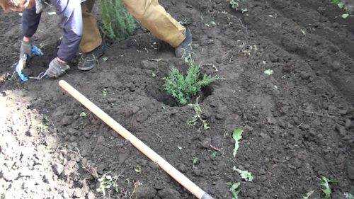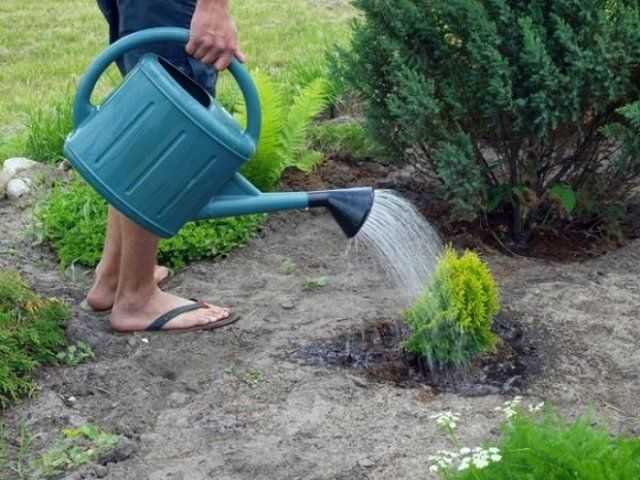 Место посадки туи слегка утаптывают во избежание образования пустот и проливают водой.