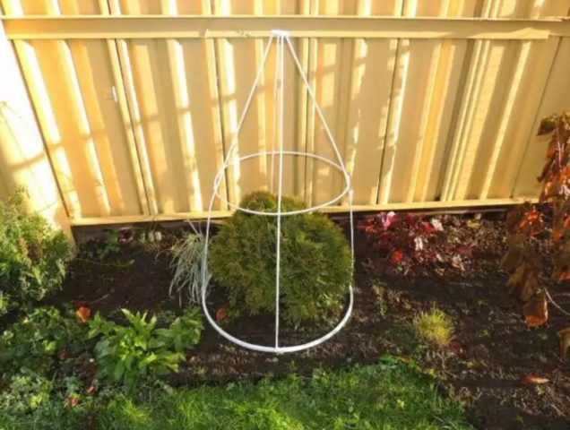 Если в местности идут сильные снегопады, стоит приобрести круглый или пирамидальный каркас для туи западной Тедди, согласно фото и описанию, что послужит защитой кроне зимой от разваливания. Сверху на конструкцию накладывают лапник или ветки после срезки кустарников. В феврале и марте туи Тедди прикрывают сеткой или агроволокном, чтобы хвоя не выгорала на солнце.