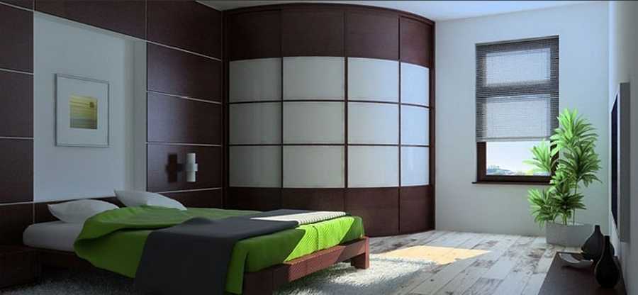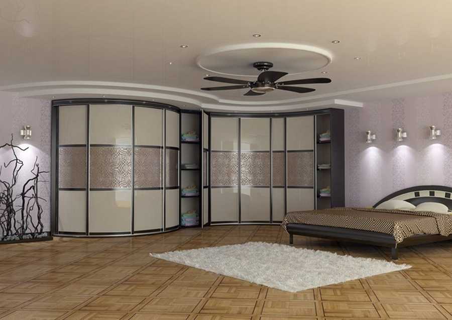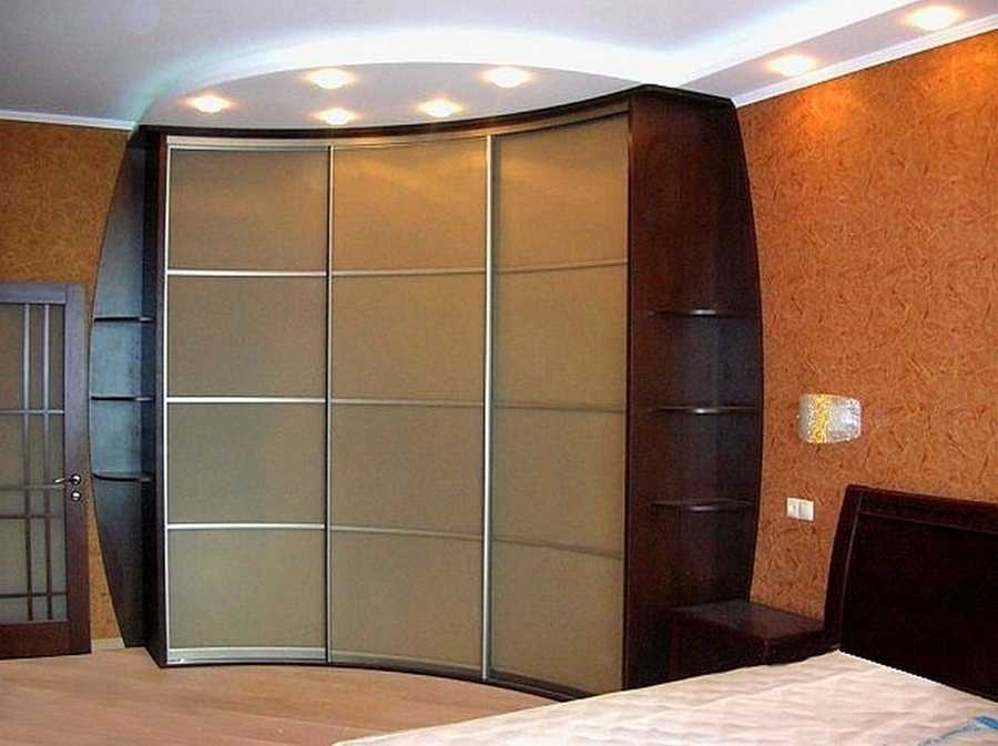 радиусный шкаф для спальной обладает вычурным дизайном, высоким уровнем вместительности, но стоит дорого. Поэтому подбирать его под маленькую спальню может быть нерационально;