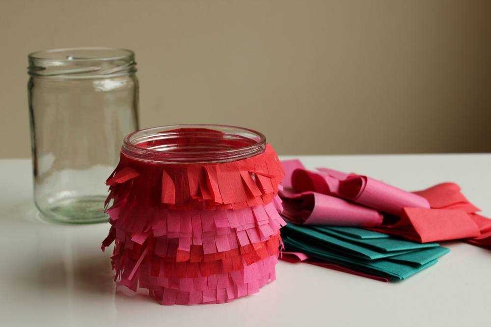 Чтобы задрапировать стеклянную поверхность, украсьте ее полосками бумаги с бахрамой. Можно использовать несколько схожих оттенков или наоборот, создать разноцветный микс из нескольких противоположных цветов. Наверх основы наклейте приготовленные цветы и листочки.