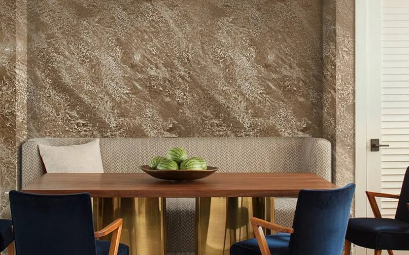 Штукатурка с глянцевым или металлизированным пигментом создает эффект мокрого шелка в интерьере кухни.