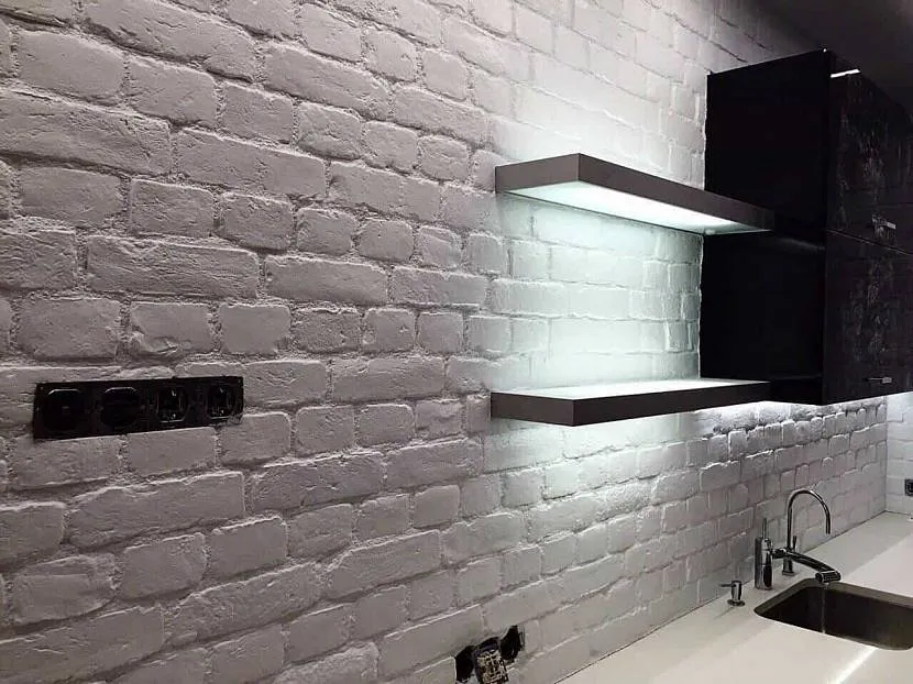 Штукатурная отделка под побеленную кирпичную кладку прекрасно будет смотреться в интерьере стиля прованс, шале, легкого кантри, лофт, скандинавском. Простота и фактурность послужат отличным фоном для мебели и разных декорирующих предметов (картин, вешалки напольной, стульев, открытых настенных полочек, свисающих прямо с потолка крупных ламп, светильников).