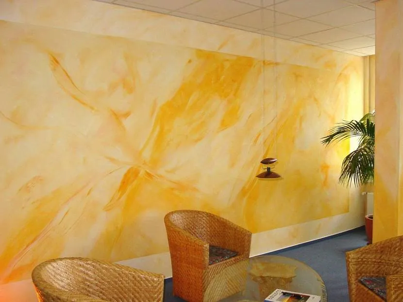 Штукатурка под мрамор выполняется гладкой или с прожилками. Цветовая палитра позволяет создать сходство с натуральным камнем.