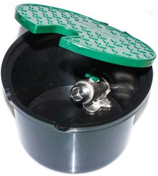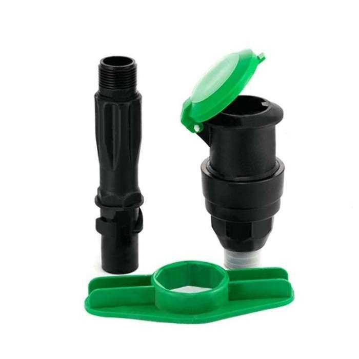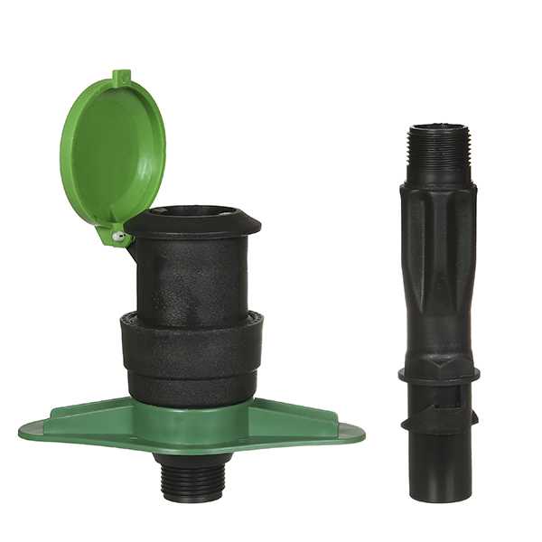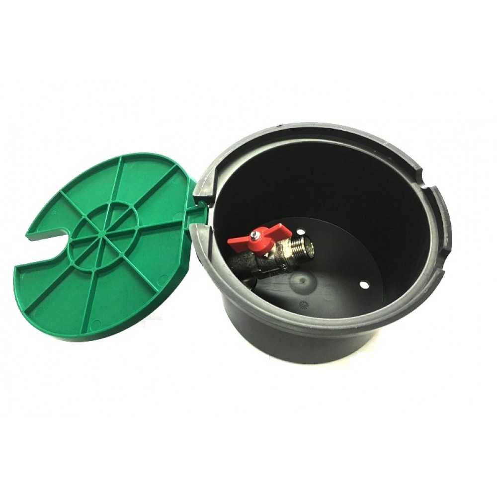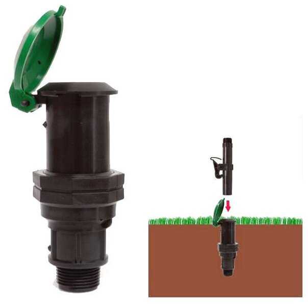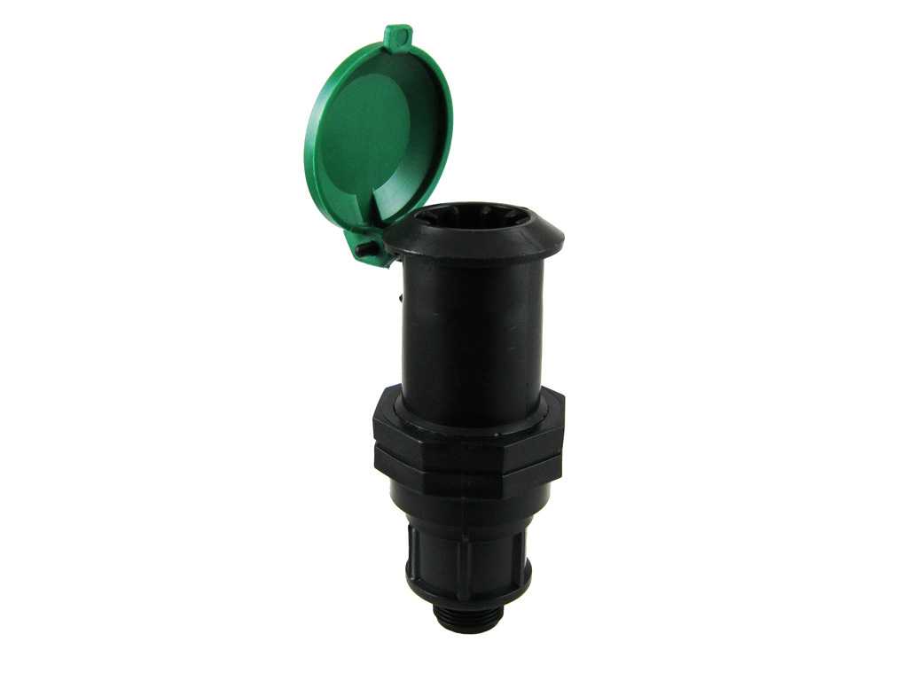 Водяная розетка от известного производителя садового оборудования. Представляет собой пластиковый цилиндр с плавно отодвигающейся подпружиненной полусферической крышкой.