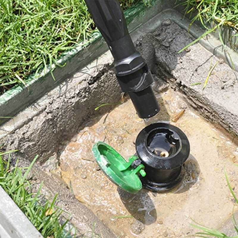 - Подземные выдвигающиеся разбрызгиватели. Они включаются по таймеру и поливают все грядки и газон вокруг теплицы.