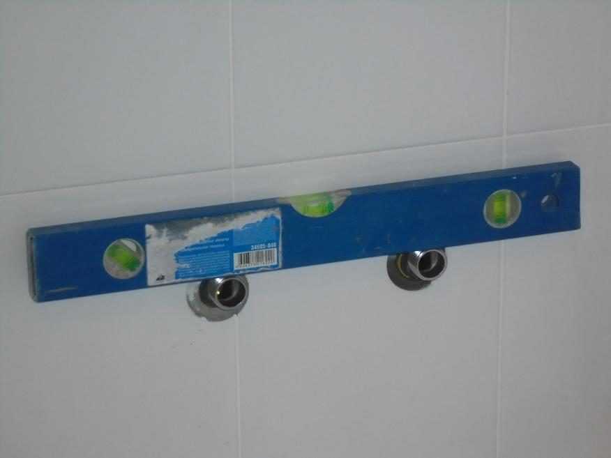 Эксцентрики пакуются уплотнителем и вкручиваются в водорозетки, подробнее о герметизации резьбовых соединений в этой статье. Положения выводов друг к другу хорошо проконтролировать уровнем — тогда смеситель встанет чётко и ровно. Путём корректировки эксцентриков нужно добиться нужного расстояния между ними — обе накидные гайки должны попадать без усилий и трений.