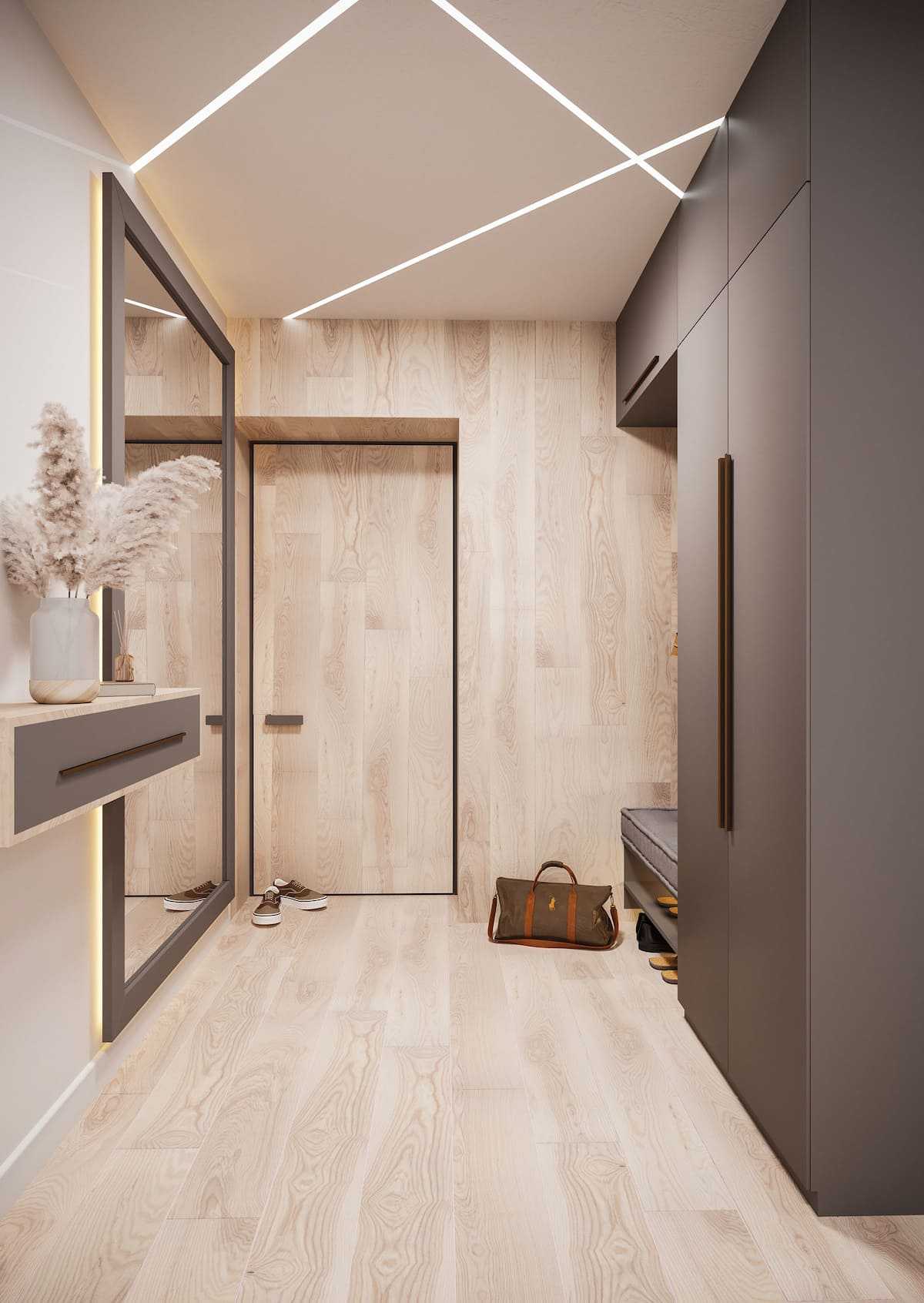 Модный интерьер узкой прихожей 2022 будет смотреться более эффектно, если сочетать разные цвета и фактуры напольного покрытия. Если уровень пола в зоне входа будет чуть ниже, чем в остальных помещениях, то прихожая будет отделяться от других частей квартиры.