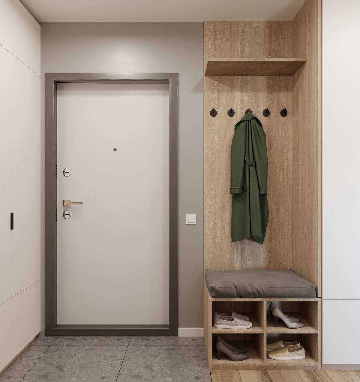 Встречается чаще, чем широкий и длинный вариант. Главный недостаток – из нее хорошо просматриваются все комнаты квартиры. Чтобы это исправить, приходится закрывать дверь в каждую из комнат. В 2022 году самым распространенным способом перепланировки прихожей такого типа считается разделение ее на две функциональные зоны.