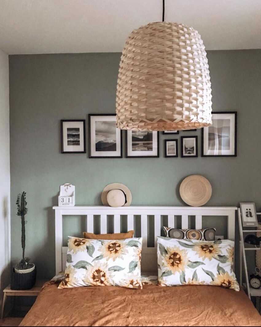Этот стиль характеризуется легкостью и тягой к естественности, благодаря чему цвет травы отлично впишется в дизайн спальни.