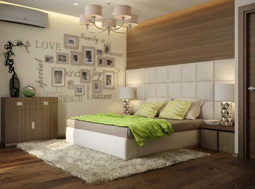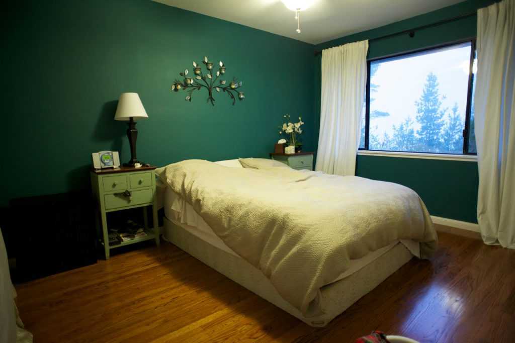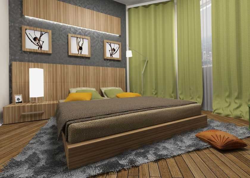 Сочетая мебель и полы коричневые, текстиль белый, зеленые стены в спальне, можно достигнуть желаемого результата.