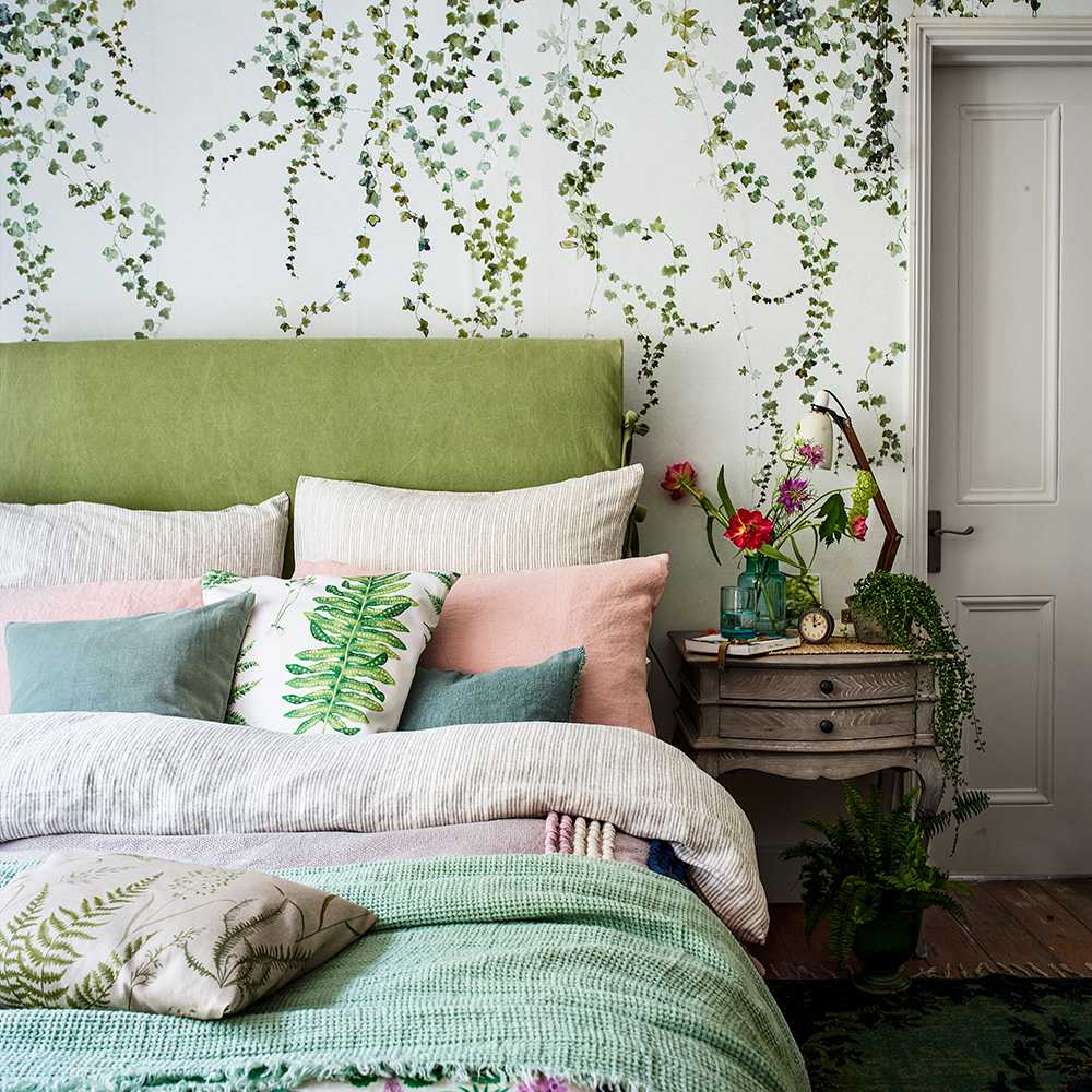В дизайн спальни в зеленых тонах с линией идеи природы можно добавить ноты флористики: