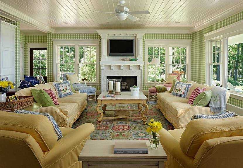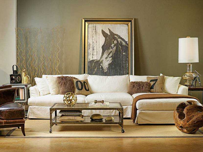 В гостиной гармонично выглядит мебель естественных коричневых или бежевых тонов в мелкую клетку на фоне оливковых стен.