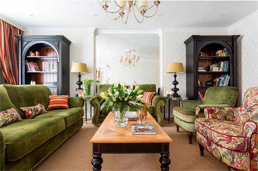 В классической гостиной гармонично будет смотреться мягкая мебель с оливковой обивкой и деревянными элементами.
