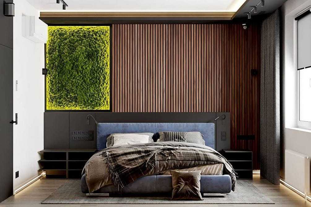 Зеленая спальня будет отлично смотреться, если вы используете гладкие, однотонные обои в сочетании с лепниной. Это решение особенно хорошо работает в элегантных интерьерах. Вы получите необычный эффект, комбинируя несколько стен, окрашенных краской, и обои на подкладке, например, с мотивом туманных листьев леса или монстеры.Зеленая спальня будет отлично смотреться с деревом. Натуральное сырье можно найти не только на полу, но и на стене.
