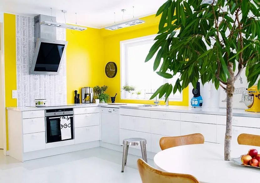Ярко-желтые стены на кухне с белым гарнитуромИсточник dekoriko.ru