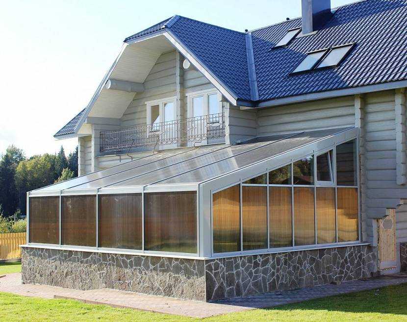 - Односкатный зимний сад, пристроенный к внешнему углу дома.