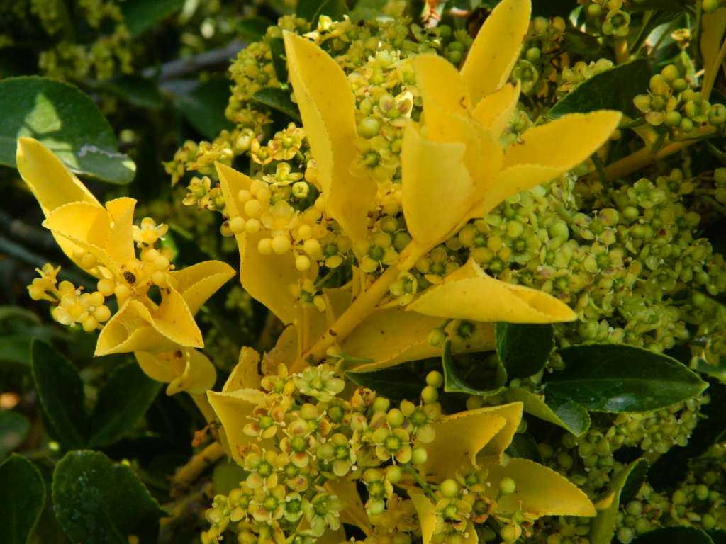 Компактный кустарник или полукустарник наращивает густую листву. Листовые пластины кожистые, плотные, с неровным или мелкозубчатым краем, жёлтой или белой каймой на зелёном фоне. Рост побегов направлен вверх под небольшим углом, что формирует приподнятую, округлую крону. Ежегодный прирост веток 15–20 см.