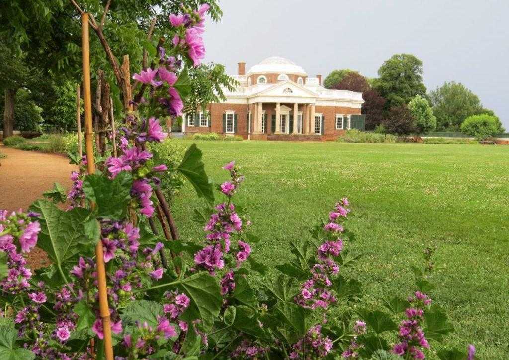Фото цветов мальвы в саду прекрасно демонстрирует великолепие этого растения среди прочей живописной зелени.