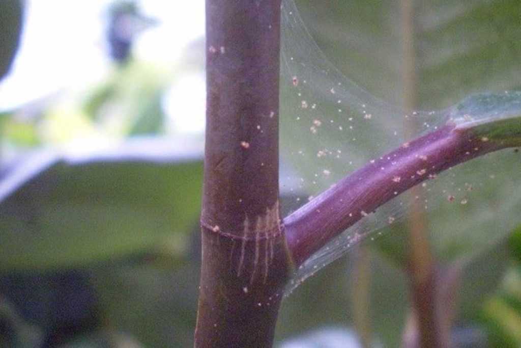 Тонкие волокна можно увидеть между стеблем и основанием листьев. Нити белого цвета, сама паутинка прозрачная. Образуется она вследствие выделения особого секрета, который мгновенно застывает. Это приводит к появлению нитей. Паутинка становится заметна, когда цветочных клещей становится много.
