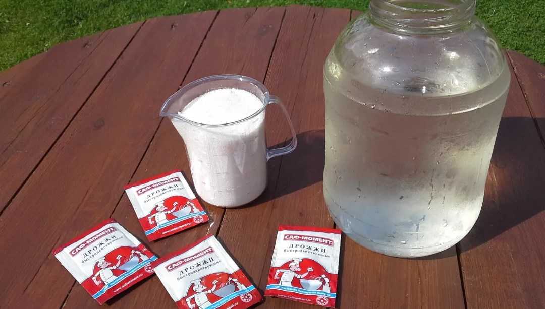- пакетик сухих дрожжей (10 г) и 10 г сахара растворяют в 1,5 л воды;
