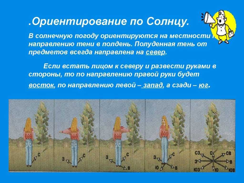 Ориентирование по солнцу позволяет определить три жизненно важных фактора: направление на стороны света, положение ориентирующегося относительно известных населенных пунктов и направление движения к знакомым объектам. Часто случается, что ни компаса, ни навигатора под рукой нет. В этом случае, определить стороны горизонта можно и по солнцу.