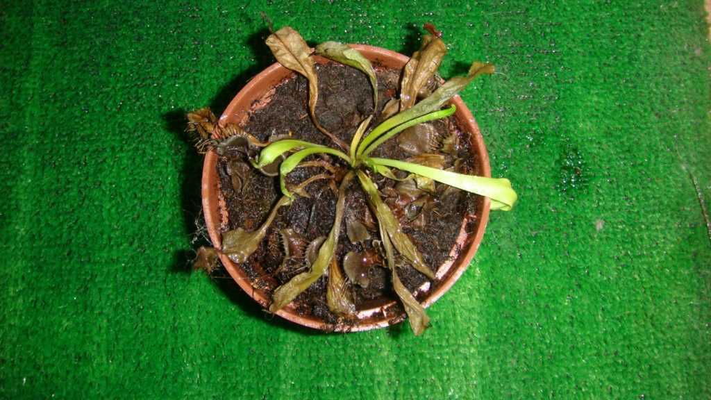 Если на молодую листву дионеи попадает прямой солнечный свет, она получает солнечные ожоги. Следует с самого начала оценить место, на котором установлен горшок. Быть может, посудину нужно затенить или куда-нибудь перенести.