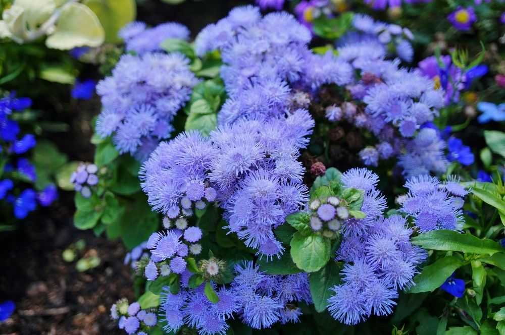 Очень хороши агератумы в клумбах из летников, где их используют большими группами или строгими рядами, доводящими контраст с другими однолетними и двухлетними растениями до абсолюта.