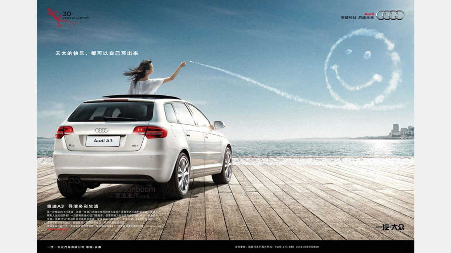 Реклама автомобиля Audi. Автомобиль выглядит мощнее за счёт вертикально скомпонованного объектаИзображение: Audi / MullenLowe China