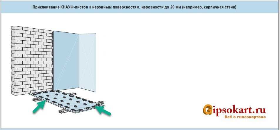 Чтобы склеить гипсокартон со стеной из бетона или кирпича с неровностями 0,5 – 2 сантиметра, делают практически то же самое, только используют другой клей и по-другому его наносят.