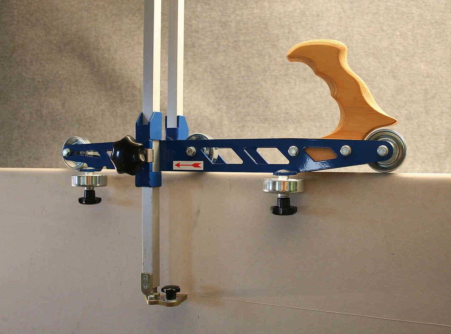Крышка такого стола решетчатая, и опирается на две ноги с упорами. На решетчатую столешницу укладывается лист, фиксируется зажимами и после разметки прижимной линейкой раскраивается в нужный размер.