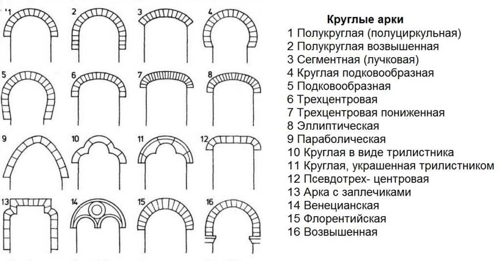 Наиболее часто встречаются следующие типы арок: