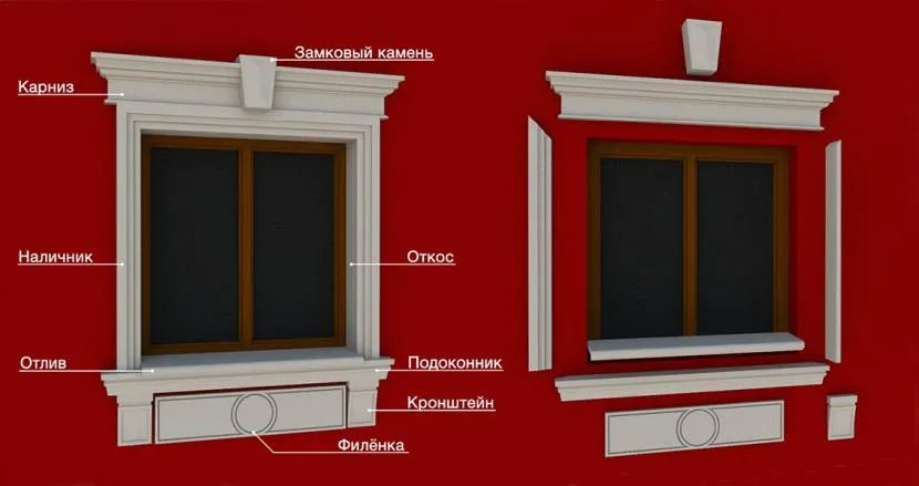 Основные элементы оконного обрамленияИсточник dekor-fasada.ru