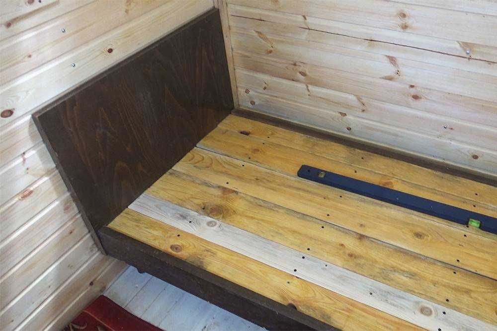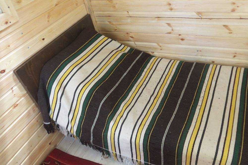 Я решил поставить в домик укороченную кровать. Для этого взял старую односпальную кровать и подрезал в ней продольные панели, за счет чего она стала короче и смогла уместиться в постройке. В кровать положил деревянный щит из обрезных досок толщиной 30 мм. Цена такого щита — около 500 Р.
