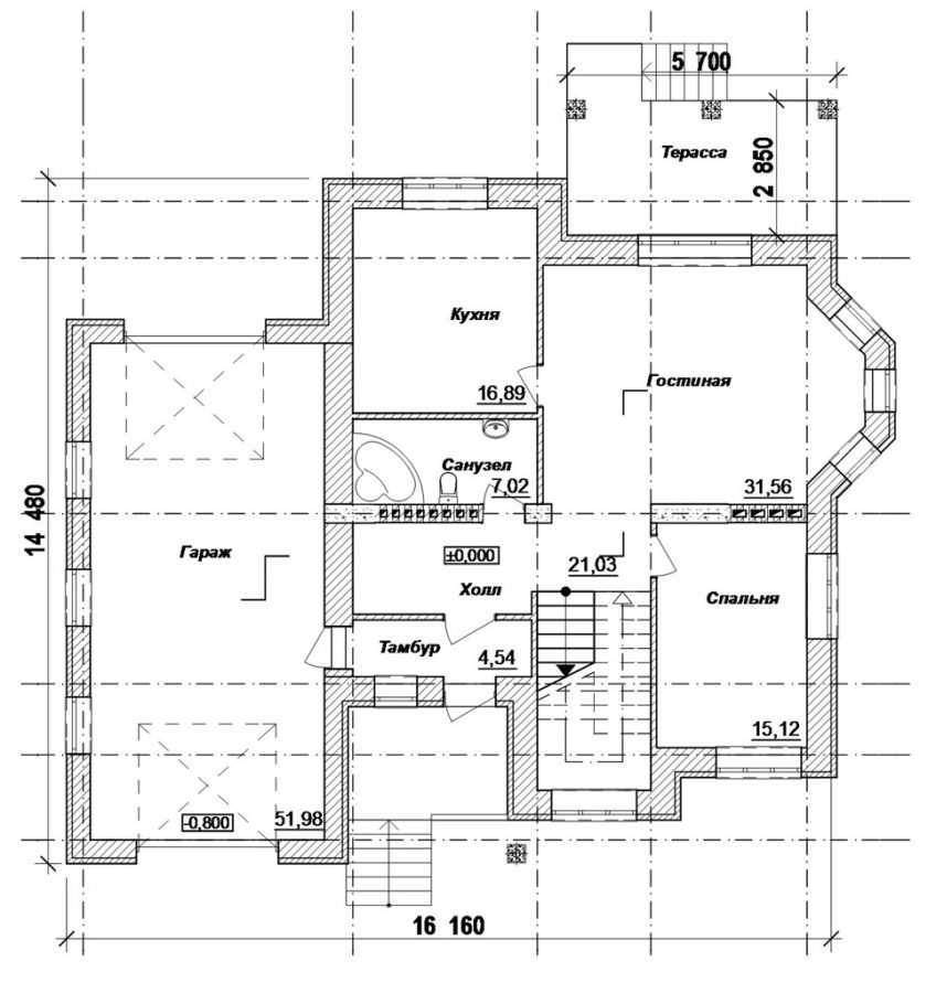 При входе, жильцы будут попадать в тамбур (4,54 кв. м.), который ведет в холл. Размер коридора составляет 21,03 кв. м. Отсюда можно попасть в кухню (16,89 кв. м.) и гостиную (31,56 кв. м.), разделяет эти пространства небольшая каменная перегородка, которая прерывается практически около капитальной стены. Вход оформлен в виде ниши, в которой будет располагаться источник подсветки. Таким образом, в ночное время только по небольшим светильникам можно обнаружить вход в гостиную, сделать это достаточно просто. Именно эта черта придает всей планировке необычность и индивидуальность.