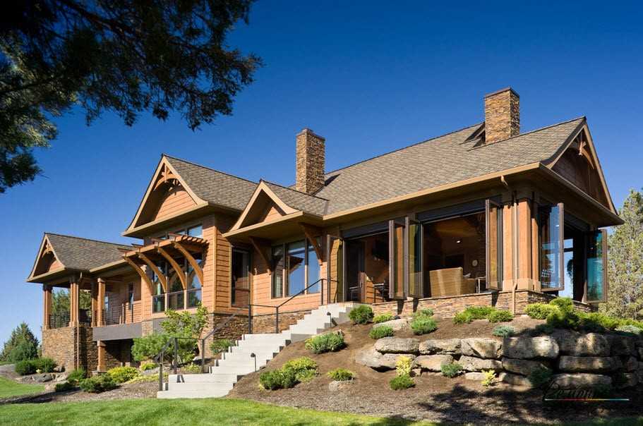Изюминка финских домов в том, что не окружающий мир и пейзаж подстраиваются под здание, а наоборот дом гармонично вписывается в ландшафт, дополняя его и создавая единую и целостную картину. К тому же и в строительстве используются натуральные материалы — дерево и необработанный натуральный камень. Зачастую им отделывают снаружи первый этаж дома, а последующие этажи и ярусы оформляют в деревянные планки.