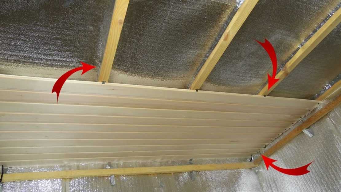 - Прикрепить к каркасу планки, а к ним – потолочное покрытие. Утеплить с фольгой будет держаться за счет реек.